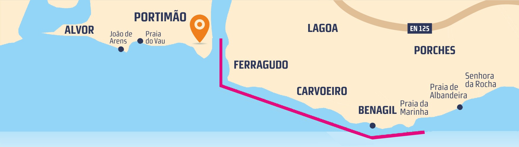 Avistará lugares como; Ferragudo, Vila de Carvoeiro, Boneca no Algar Seco e o Farol de Alfanzina, bem como admiráveis praias; a Praia do Vale Centeanes, a Praia do Carvalho, a Praia do Benagil e a mundialmente famosa “Praia da Marinha”.